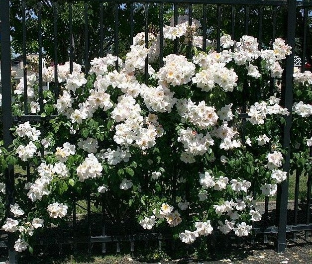 A strong-growing shrub. Large, almost single, creamy-white flowers are produced in closely packed, large bunches. An excellent pillar rose, it also threads through fences, frames windows, and reaches through open-habit shrubs to find the sky. A free flowering rose that is nearly always in bloom. Light fragrance. Tolerant of some shade.