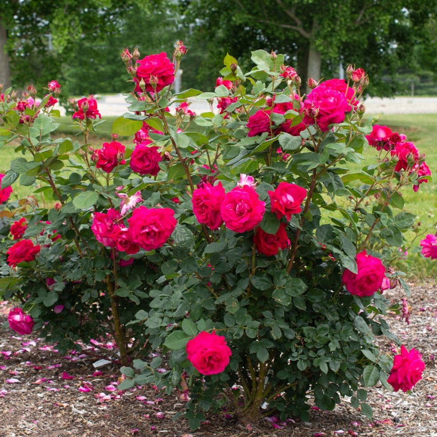 Vibrant double blooms in rich cherry-red tones. These striking flowers are beautifully set against semi-glossy, dark-green foliage and release a delicious sweet fragrance with distinctive notes of pear and clove. Great for cutting and bringing inside. Excellent disease resistance, this well rounded grandiflora is a reliable repeat bloomer and a standout choice for any garden.